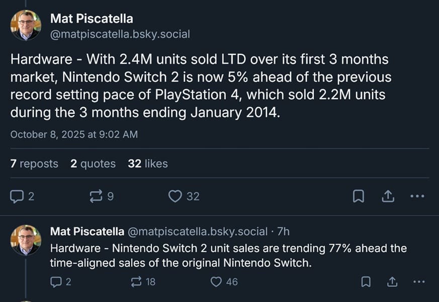 Aunque las ventas se han desacelerado ligeramente tras el lanzamiento, el patrón es similar al observado con la PS4: un pico inicial masivo seguido de una estabilización del mercado. En comparación directa, la consola de Sony registró 2,2 millones durante el mismo periodo, lo que sitúa a la Switch 2 un 5% por encima. Además, supera a la Switch original en un 77% durante sus tres primeros meses.