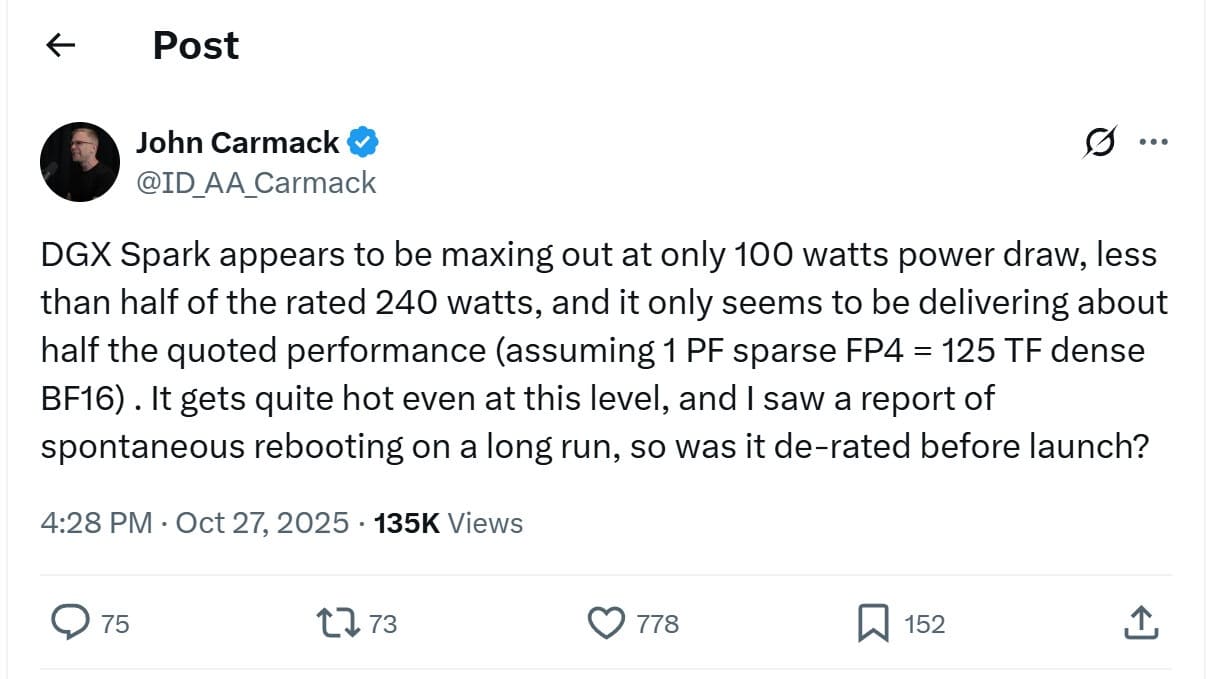 El NVIDIA DGX Spark, una máquina diseñada para prototipado rápido de inteligencia artificial local, parece no estar cumpliendo con las cifras prometidas por la compañía. Según el desarrollador John Carmack, fundador de Keen Technologies y ex CTO de Oculus VR, el rendimiento real del sistema se sitúa muy por debajo de las especificaciones oficiales, con un consumo que apenas alcanza los 100W, frente a los 240W que NVIDIA había anunciado.
