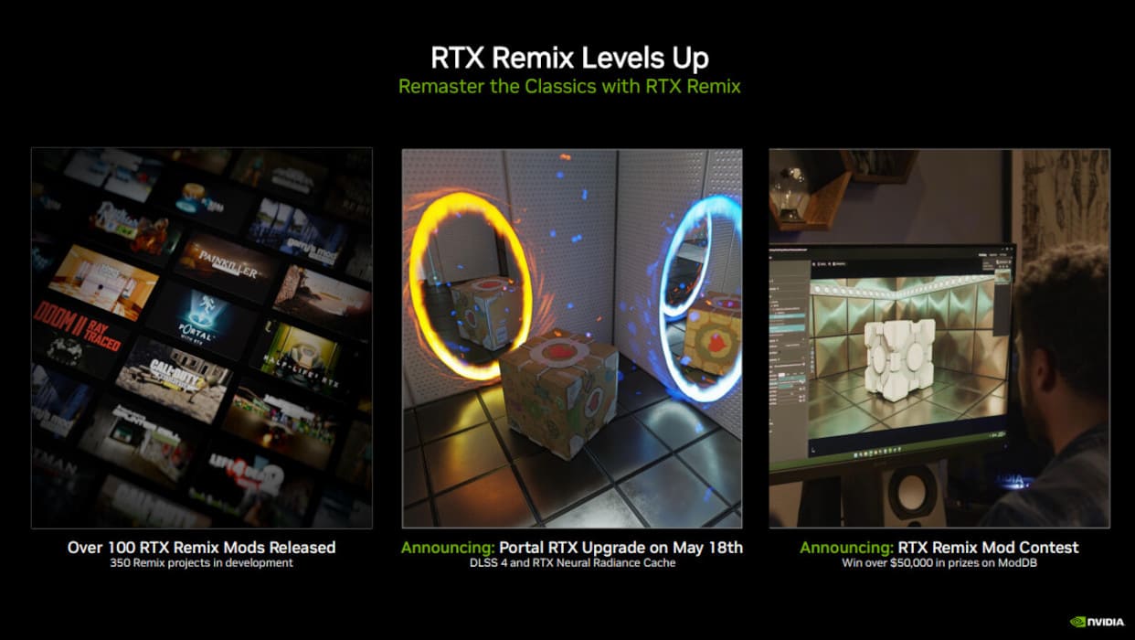 NVIDIA también ha confirmado que Portal RTX recibirá una actualización importante, incorporando DLSS 4, caché de radiancia neuronal RTX (neural radiance cache) y otras tecnologías de su última generación gráfica.