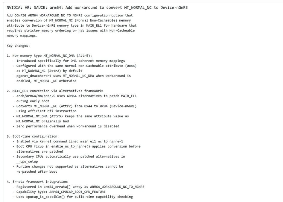 Para mitigar el problema, NVIDIA ha implementado soluciones a nivel de kernel Linux dentro de sus NV-Kernels, mantenidos en repositorios independientes para su hardware. Estos kernels incluyen un parche que convierte el atributo MT_NORMAL_NC a Device-nGnRE (non-Gathering, non-Reordering, Early acknowledgement).
