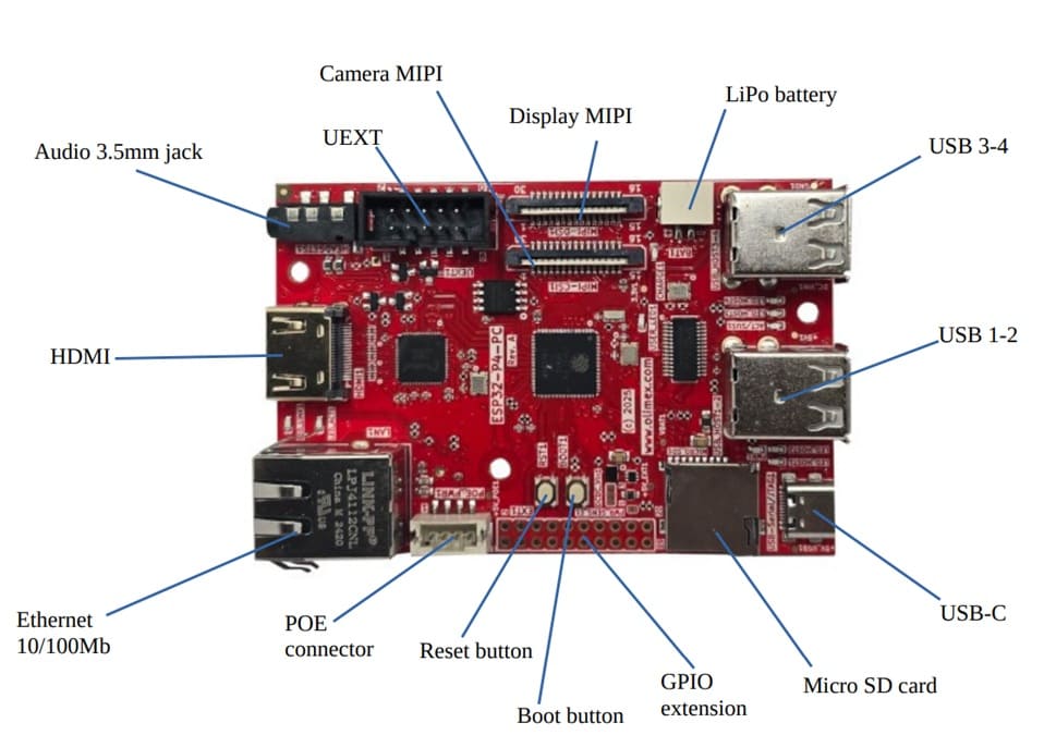 La placa añade interfaz MIPI DSI/CSI para pantallas y cámaras, conector de audio de 3,5 mm, Ethernet 10/100 Mbit con soporte PoE opcional, además de cuatro USB 2.0, cabecera GPIO de 20 pines, puerto JTAG para depuración y expansión mediante UEXT.