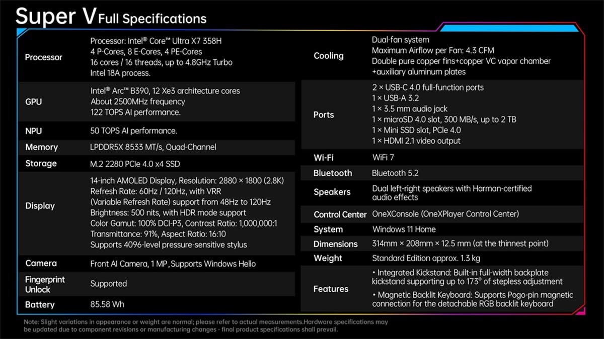 Uno de los puntos más atractivos del Super V es su precio. El dispositivo se ofrece con 48 GB de RAM LPDDR5X y 1 TB SSD PCIe 4.0 por 1.899$ (~1.620€), posicionándose claramente por debajo del ROG Flow Z13, que parte de 2.299,99$ (~1.963€) con menos memoria.