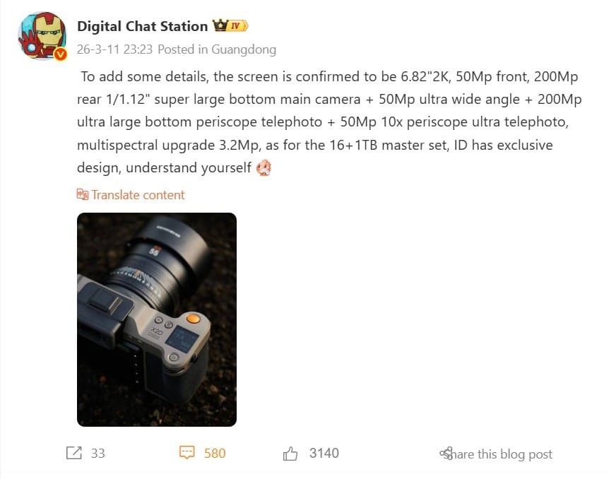 En las últimas semanas han aparecido en redes chinas diversas filtraciones relacionadas con el módulo de cámara del dispositivo, incluyendo imágenes de un supuesto extensor telefoto de 300 mm y fotografías de un módulo de cámara oculto bajo carcasa de prueba. Ahora, varios filtradores han compartido también un render del supuesto diseño final del sistema de cámaras, aunque su autenticidad sigue generando dudas.