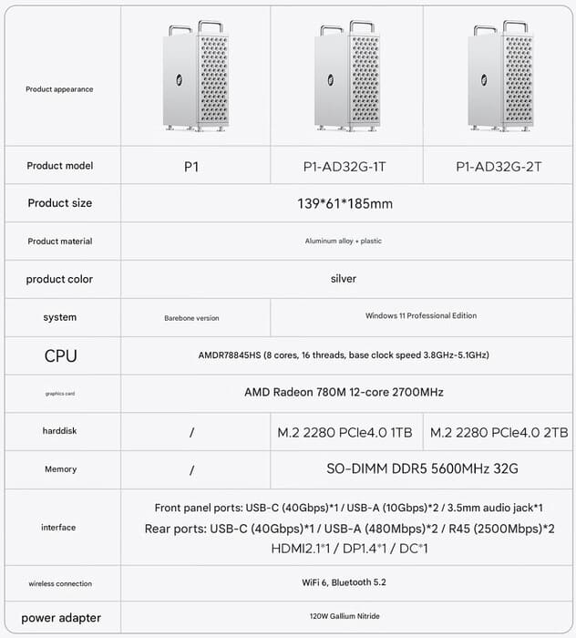 El mini PC integra además Wi-Fi 6, Bluetooth 5.2 y un sistema de refrigeración eficiente diseñado para mantener bajo control las temperaturas del Ryzen 7 8845HS incluso en cargas sostenidas. El conjunto se alimenta mediante un adaptador GaN de 120W, que mejora la eficiencia energética y la estabilidad del suministro eléctrico.