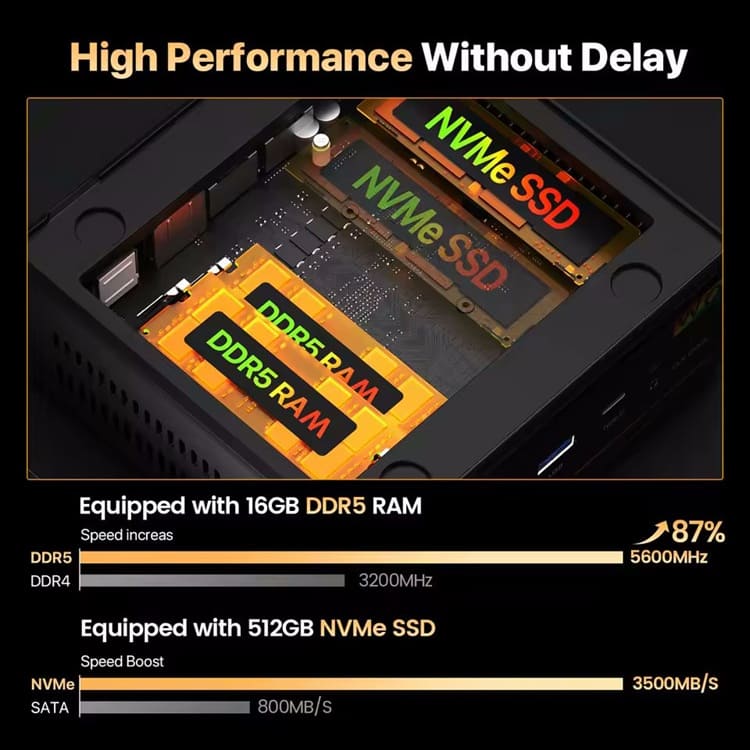 En cuanto a la memoria, el Peladn WO-4 emplea DDR5 de doble canal, garantizando mayor ancho de banda y eficiencia energética respecto a DDR4. En conjunto con la GPU integrada Radeon 760M, el sistema puede manejar sin problemas vídeo 4K y aceleración por hardware, aunque no está orientado al gaming exigente.