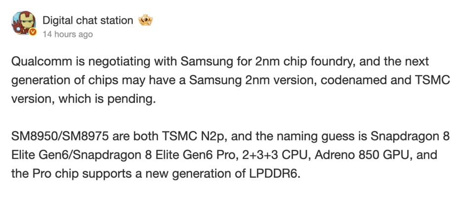 La información más llamativa de la filtración es que TSMC podría no ser la única fundición implicada. Digital Chat Station apunta a que Qualcomm también estaría trabajando en una variante fabricada por Samsung Foundry utilizando su proceso de 2 nm. De confirmarse, supondría una diversificación estratégica en la producción de la serie Snapdragon 8 Elite, algo que Qualcomm ya ha hecho en el pasado con resultados desiguales.