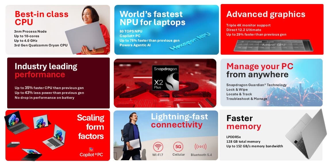 El objetivo de Qualcomm con Snapdragon X2 Plus no es solo competir en potencia bruta, sino consolidar una experiencia fluida en multitarea, análisis de datos, creación de contenido ligero y trabajo colaborativo, todo ello dentro de chasis ultraportátiles y sin depender de sistemas de refrigeración agresivos.