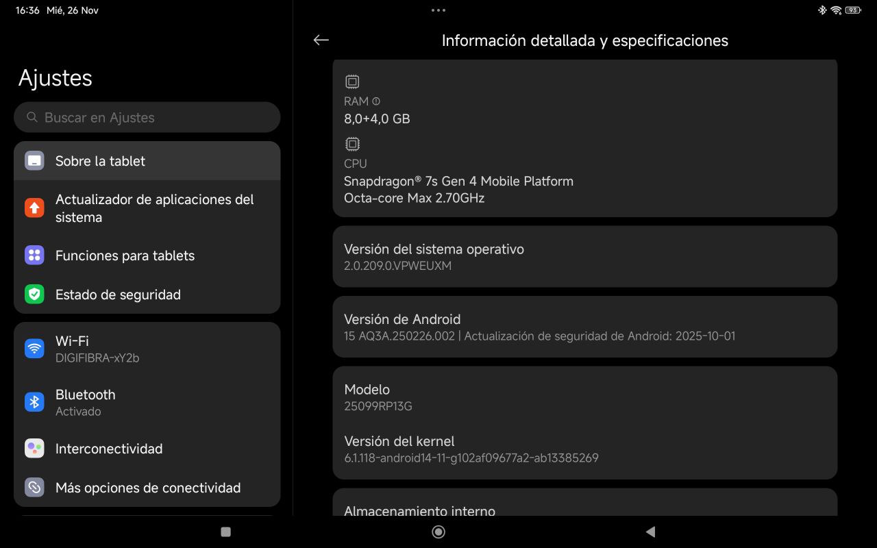 El sistema operativo Android 15 con HyperOS 2 ofrece una experiencia fluida, con optimizaciones propias de Xiaomi y una interfaz pensada para aprovechar la pantalla grande. El lápiz inteligente se integra con funciones de notas rápidas y aplicaciones de dibujo, mientras que el teclado permite un uso más cercano al de un portátil.