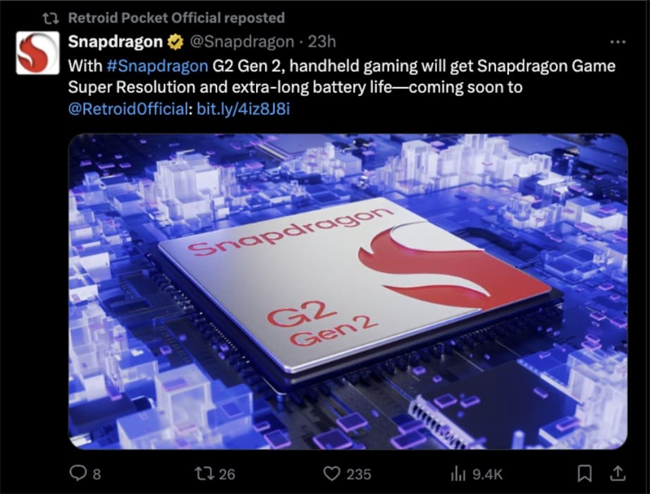 Aunque el fabricante aún no ha confirmado el nombre del dispositivo, varias pistas apuntan a que podría incorporar el Snapdragon G2 Gen 2, un SoC de Qualcomm diseñado específicamente para consolas portátiles. De hecho, la propia Qualcomm ya adelantó en marzo que Retroid sería una de las primeras marcas en adoptar este chip.