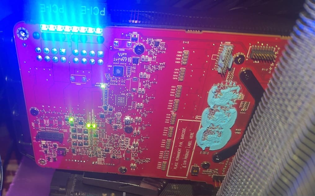 La GPU utiliza una PCB completamente roja, un detalle poco habitual en tarjetas modernas, y deja a la vista varios conectores expuestos en la parte trasera, algo típico de hardware destinado a pruebas internas, validación y depuración, no a usuarios finales. Todo apunta a que se trata de una unidad empleada durante fases tempranas del desarrollo.