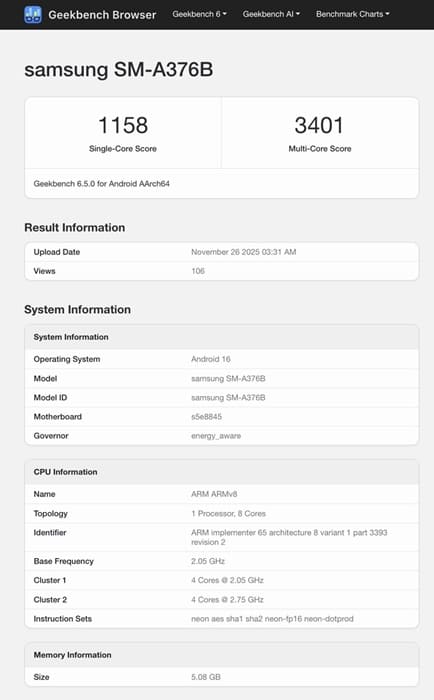 El listado de Geekbench muestra al presunto Galaxy A37 ejecutando Android 16, junto con 6 GB de RAM y el chip Exynos 1480 acompañado por la GPU Xclipse 530, en lugar del Snapdragon 6 Gen 3 que integra el actual Galaxy A36. Además, figura el número de compilación P4A.251205.006.A376BXXU0AYK3, lo que sugiere un firmware de pruebas internas aún en desarrollo.