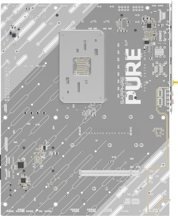 Las imágenes filtradas muestran una placa base Sapphire PURE X870A con una estética dominada por tonos blancos, plateados y grises, en línea con la identidad visual de la gama PURE. La cubierta del chipset y el escudo del panel trasero presentan un acabado metálico minimalista, mientras que los disipadores VRM parecen incorporar un nuevo diseño de aletas extendidas para mejorar la refrigeración de la alimentación del CPU.