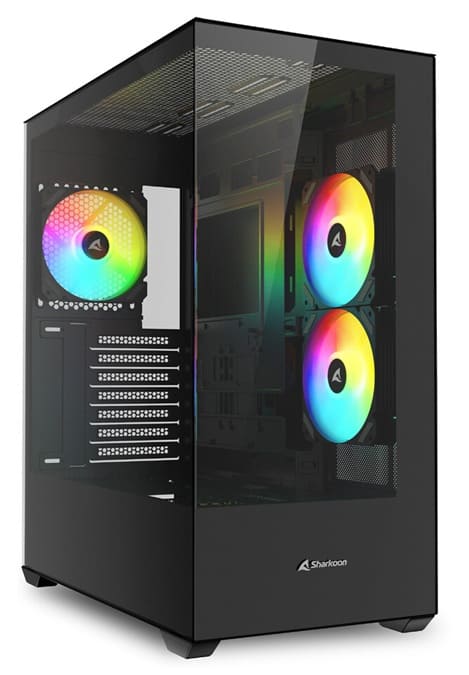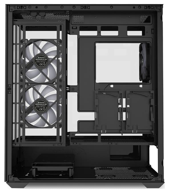 De serie, el Sharkoon SK6 ARGB incorpora tres ventiladores ARGB PWM de 120 mm, dos de ellos con flujo invertido, encargados de introducir aire fresco desde el lateral del chasis. Esta configuración permite mantener una presión de aire equilibrada incluso con el frontal de cristal.
