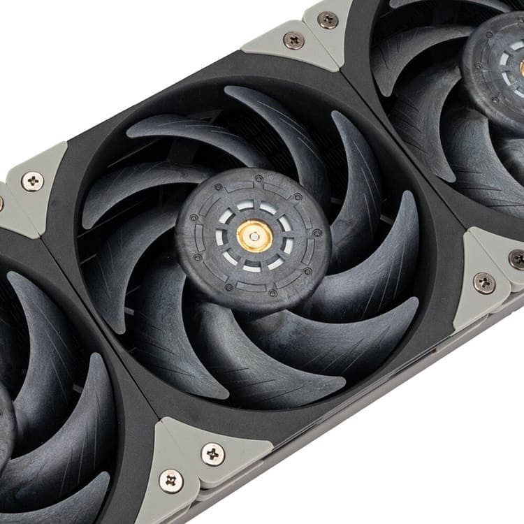 El kit incluye tres ventiladores de 120 mm con doble rodamiento de bolas y hélices fabricadas en polímero de cristal líquido (LCP), un material más resistente a la deformación. Cada ventilador opera con control PWM de 4 pines, alcanzando velocidades entre 800 y 3.000 RPM.