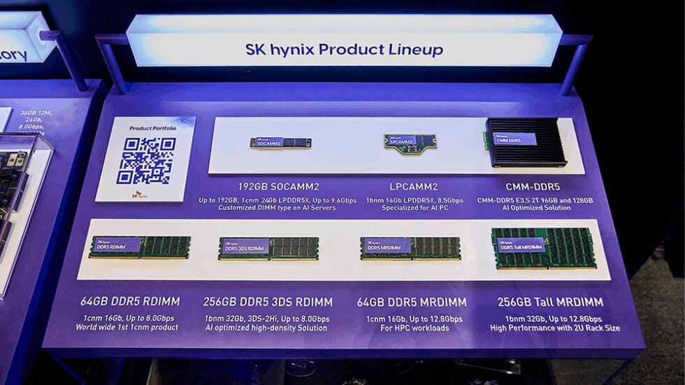 En la zona expositiva del evento, SK hynix mostró una amplia gama de desarrollos alineados con esta estrategia. Entre ellos destacaron el HBM4 de 12 capas, la integración del NVIDIA GB300 Grace Blackwell Superchip con HBM3E de 36 GB, y módulos RDIMM, MRDIMM y CXL-DDR5 optimizados para cargas de IA.