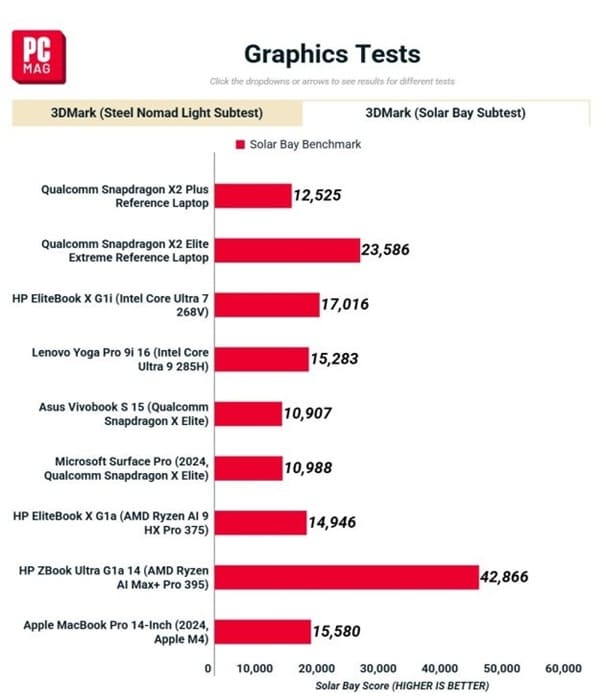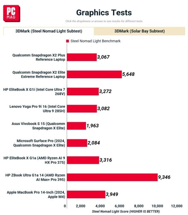 Las comparativas han sido publicadas por PCMag, utilizando un Snapdragon X2 Plus en diseño de referencia, lo que conviene tener en cuenta, ya que las versiones comerciales podrían rendir ligeramente por debajo dependiendo del sistema de refrigeración y configuración final.