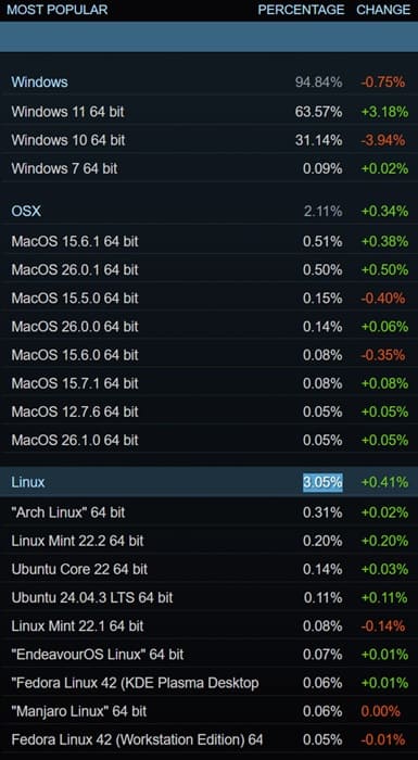 Según el informe, 3,05% de los usuarios activos de Steam utilizan Linux, lo que representa un incremento del 33% respecto a octubre de 2024, cuando la cuota era del 2%. Este avance permite a Linux superar oficialmente a macOS, que en el mismo periodo se situó en 2,11%.