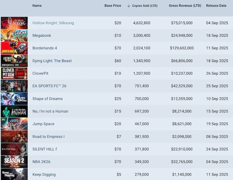 El estudio señala que el título medio de Steam es hoy más accesible, aunque los grandes lanzamientos AAA siguen dominando las ventas. En septiembre de 2025, pese a cifras iniciales más modestas, Borderlands 4 terminó como el tercer juego más vendido del mes. Otros superventas como Dying Light: The Beast, EA Sports FC 26 y Silent Hill f también figuraron en la lista, todos con precios superiores a 60$. Sin embargo, ninguno igualó el ritmo de ventas de Hollow Knight: Silksong (20$) o del éxito independiente Megabonk (10$).