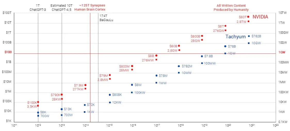 Esta diferencia de magnitud abre la puerta a entrenar modelos con billones de parámetros, acercándose a la escala de procesamiento del cerebro humano, con un coste y consumo mucho menores. Según las estimaciones de Tachyum, su infraestructura permitiría alcanzar niveles de computación que requerirían 8 billones de dólares y 276 GW con soluciones actuales, por tan solo 78 mil millones de dólares y 1 GW de potencia.