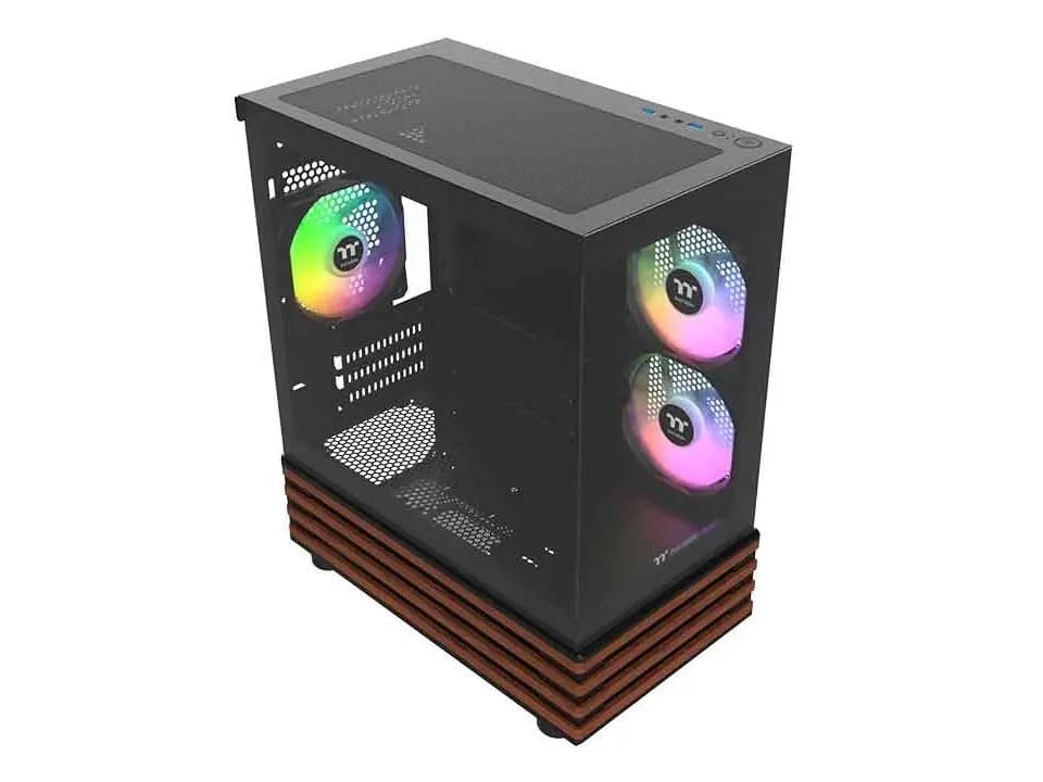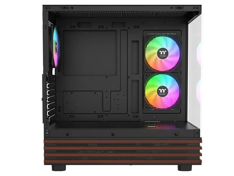 El diseño permite añadir ventiladores adicionales en la parte superior y sobre el compartimento de la fuente de alimentación, facilitando una escalabilidad térmica razonable para configuraciones compactas. La estructura mantiene un peso moderado, paneles laterales transparentes y detalles de madera integrados en el frontal y el lateral inferior.