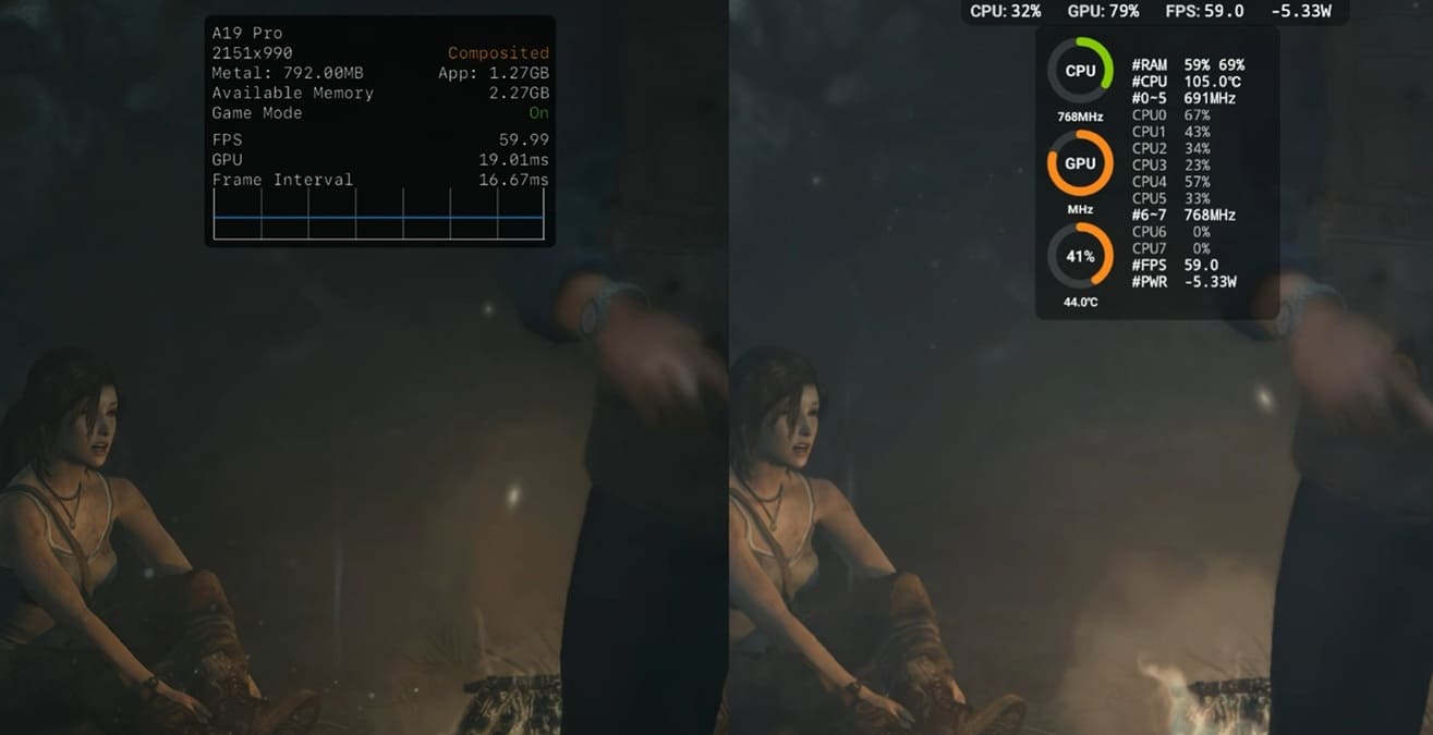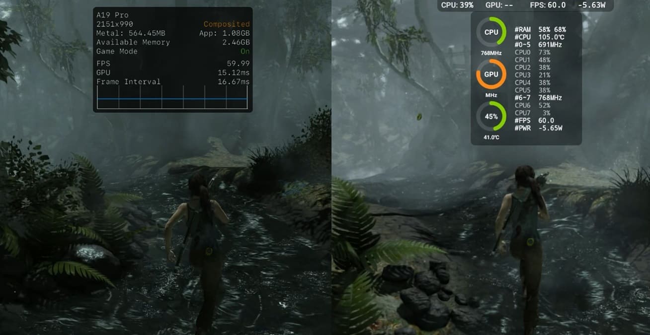 Según las pruebas mostradas por Dame Tech, el iPhone 17 Pro Max es capaz de ofrecer mejor calidad de texturas y una resolución interna más alta manteniendo los 60 FPS en el modo Performance del juego. En concreto, la versión de iOS renderiza a 2.151 × 990 píxeles, una cifra que no se muestra de forma explícita en el terminal Android utilizado para la comparación, el REDMAGIC 11 Pro.