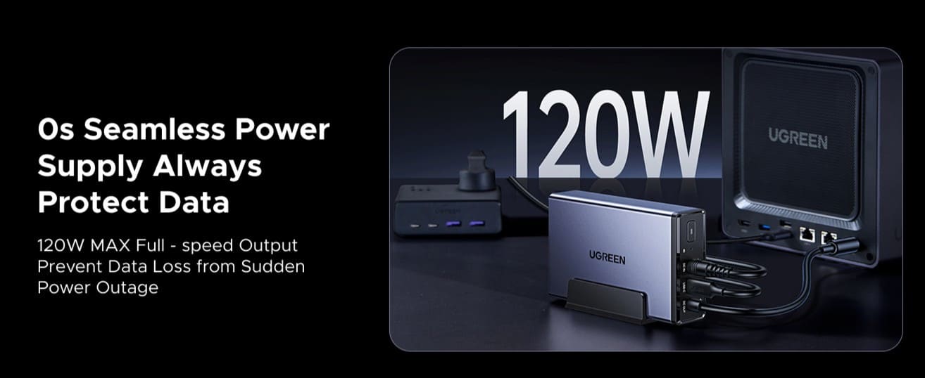 El Ugreen US3000 ofrece una potencia máxima de salida de 120W, lo que lo hace adecuado para la mayoría de los NAS de bajo consumo. No obstante, el fabricante aclara que no es compatible con las series DXP6800 y DXP8800, modelos de mayor capacidad y demanda energética.