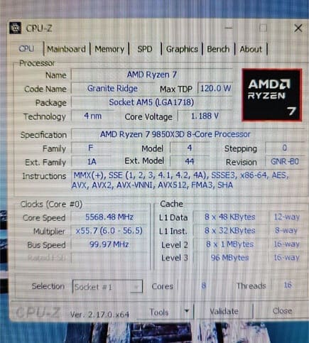 Además, otro usuario afirmó estar experimentando con un Ryzen 7 9850X3D temprano en una placa MSI MPG CARBON WIFI, intentando superar los 5.700 MHz, según capturas compartidas junto a herramientas como CPU-Z.