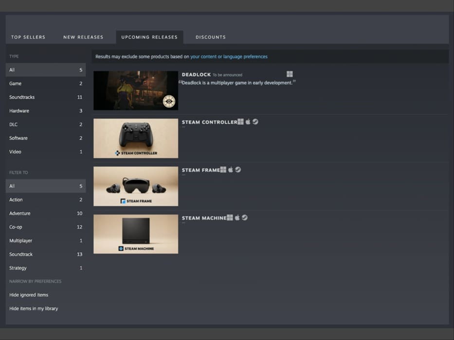 Los filtros internos de la tienda agrupan los próximos productos en dos categorías: Game y Software. Según esta clasificación, aparecen dos elementos en la categoría de juegos. Sin embargo, únicamente se muestra Deadlock como título visible, lo que significa que existe otro juego marcado como tal, pero no listado públicamente.