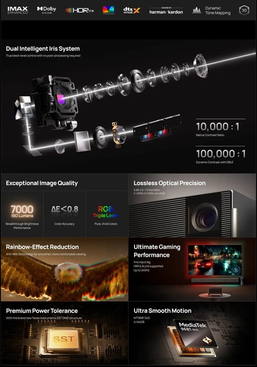 El Titan Noir Max se posiciona como el modelo más avanzado, integrando tecnología de láser triple RGB junto a un sistema de doble iris dinámico, lo que permite un control más preciso sobre la profundidad de imagen y el comportamiento del contraste en escenas complejas.