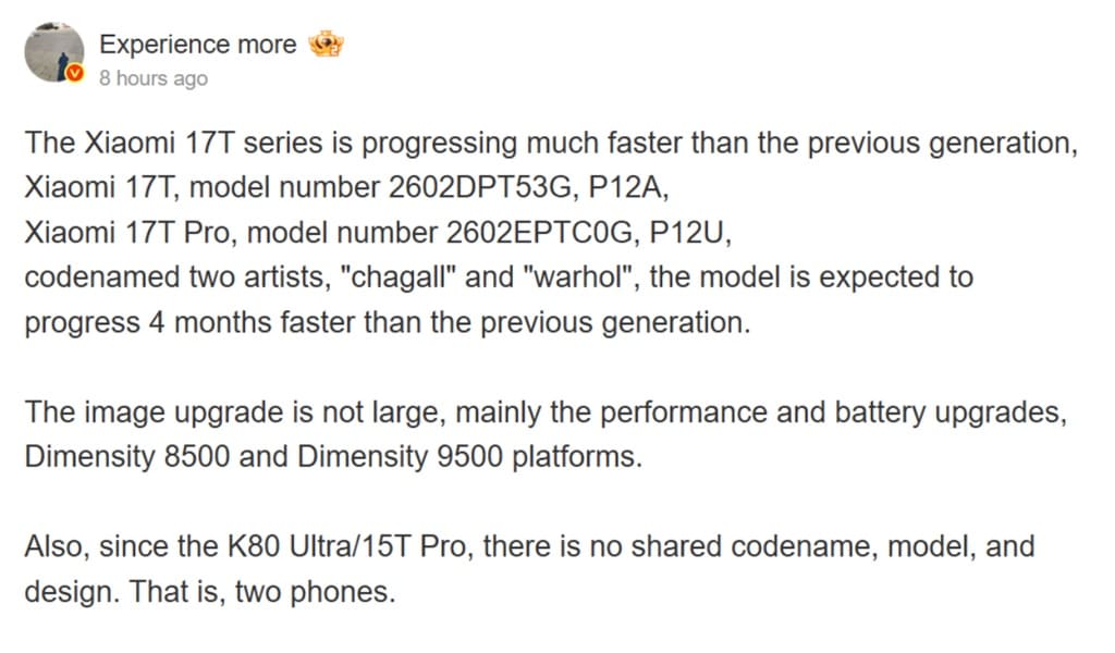 Según la información publicada en Weibo por Experience more, el Xiaomi 17T Pro y el Redmi K90 Ultra serían dos dispositivos completamente distintos, rompiendo con la política de reutilización directa de hardware entre gamas. Esto supondría una separación más clara entre la línea Redmi K Ultra enfocada al mercado chino y la serie T global.