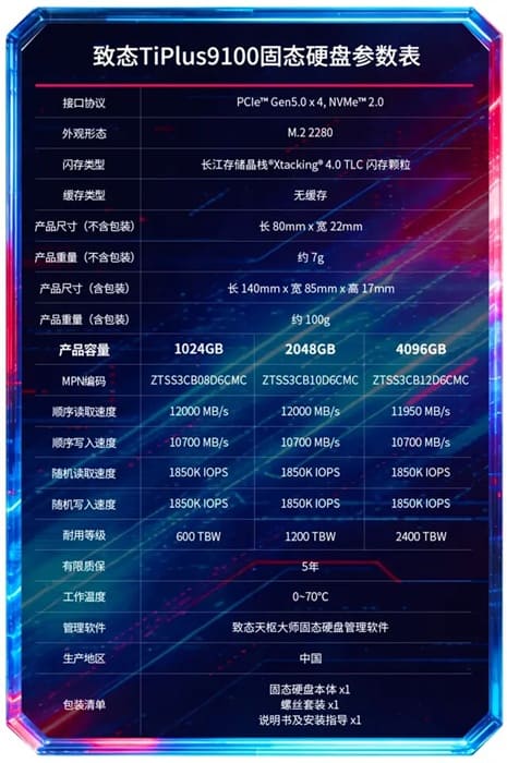 Zhitai TiPlus 9100 debuta con PCIe 5.0, hasta 12.000 MB/s y NAND Xtacking 4.0 de YMTC