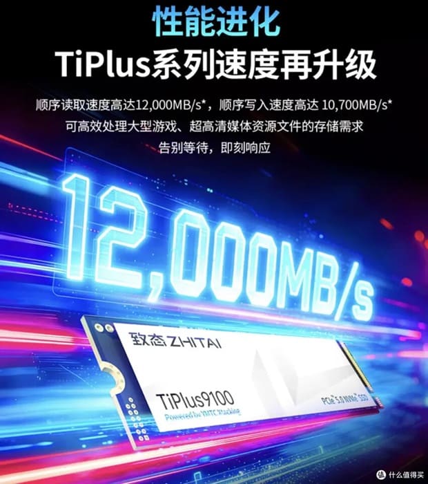 El Zhitai TiPlus 9100 alcanza velocidades de hasta 12.000 MB/s en lectura secuencial y 10.700 MB/s en escritura, situándose dentro del segmento alto de SSD Gen 5 y compitiendo con modelos más avanzados del mercado.