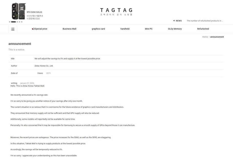 Posteriormente, Zotac Corea publicó un aviso oficial en su cuenta de Tagtag Mall, anunciando el fin de un descuento del 2% aplicado apenas un mes antes. La empresa justificó la decisión señalando que el suministro de memoria será insuficiente, que la disponibilidad de GPUs se reducirá y que algunos modelos podrían desaparecer temporalmente del mercado.