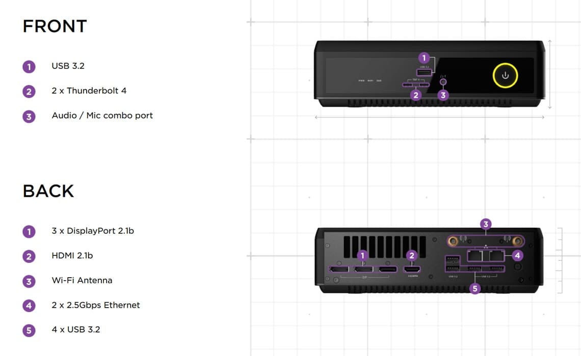 En el apartado de conectividad, el mini-PC incluye dos puertos Thunderbolt 4, tres DisplayPort 2.1b y HDMI, permitiendo conectar hasta tres monitores 4K 240 Hz sin recurrir a Display Stream Compression (DSC). En el frontal, incorpora puertos USB de alta velocidad, lector de tarjetas SD y conector de audio, mientras que en la parte trasera se encuentran las salidas principales y la alimentación.